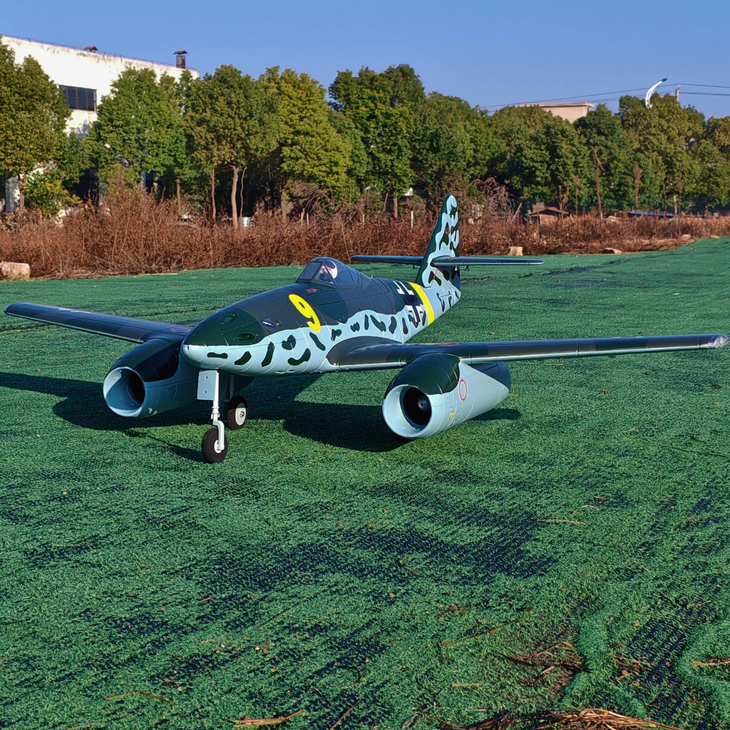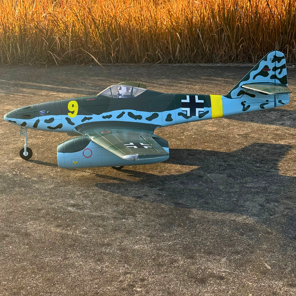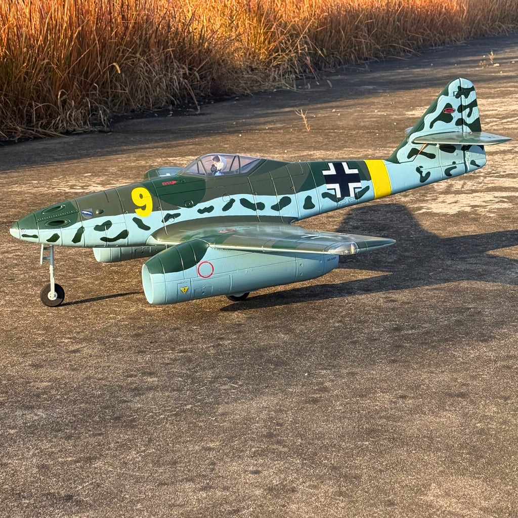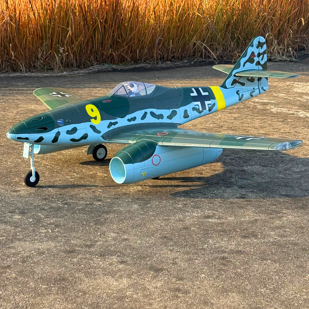 黄色と黒のカラーリングは鮮やかで人目を引くもので、どこへ飛んでも注目を集めることでしょう。DynamRCはスケールモデルをお届けします。 ME-262 V3をEPOフォームで再現。12枚羽根の70mmダクテッドファン2基と、TomCat Skylord 80A電動スピードコントローラー2基を搭載し、アドレナリン全開のスピードまで容易に加速します。さらに素晴らしいのは、このモンスター級のパワープラントを支えるのに必要なのは、6セル 22.2V 5200mAh Li-Po 30Cバッテリー1個だけという点です。操縦可能なノーズホイールと金属製の電動リトラクト機構により、ランディングギアはゆっくりと格納され、リアルな操縦性を実現します。操縦ホーン、ダクテッドファン、サーボはプリインストール済みなので、組み立ては簡単かつ迅速です。
