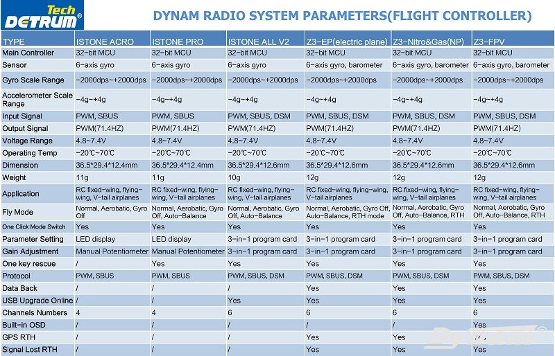 Z3-FPV is compatible with Spektrum, Futaba, Detrum and all other transmitters on the market, and supports DSM, S.BUS, PPM receivers. And by connecting with Detrum’s programming card, it is convenient for parameter setting and simple and intuitive operation. When working with Blitz-DT9 and RXC9M receivers, it can transmit real-time information such as voltage, altitude, speed, posture, distance, satellite signals, etc. to the transmitter, and can perform voice broadcast. And record the maximum value and average value of information after the aircraft landed for analysis.