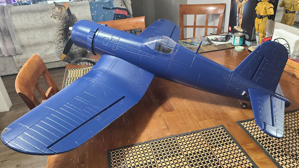 The F4U RTF-type airplane features a GAVIN 8-channel 2.4 GHz radio system allowing precise control over its movement and direction. It also comes with various advanced features, including retractable landing gear, flaps, and operational navigation lights.